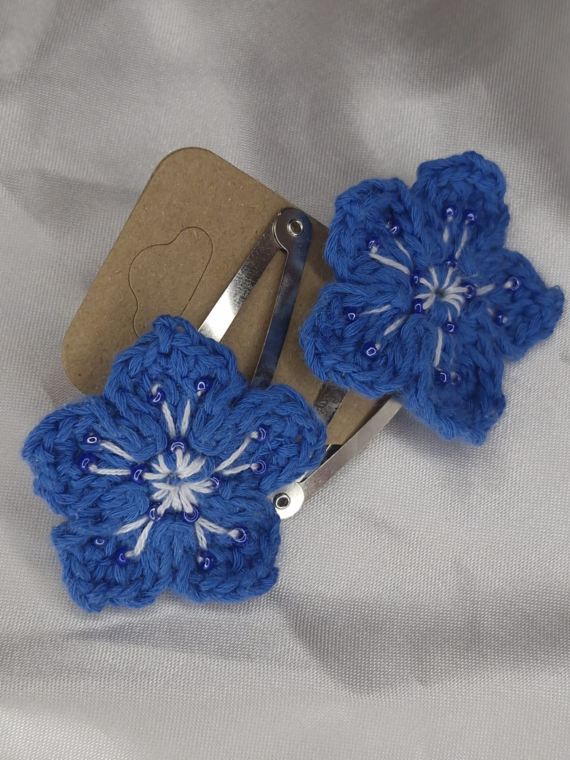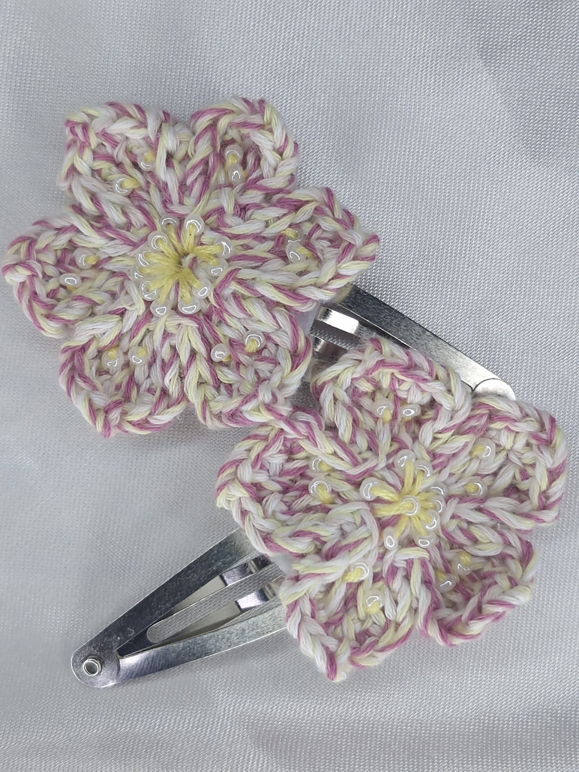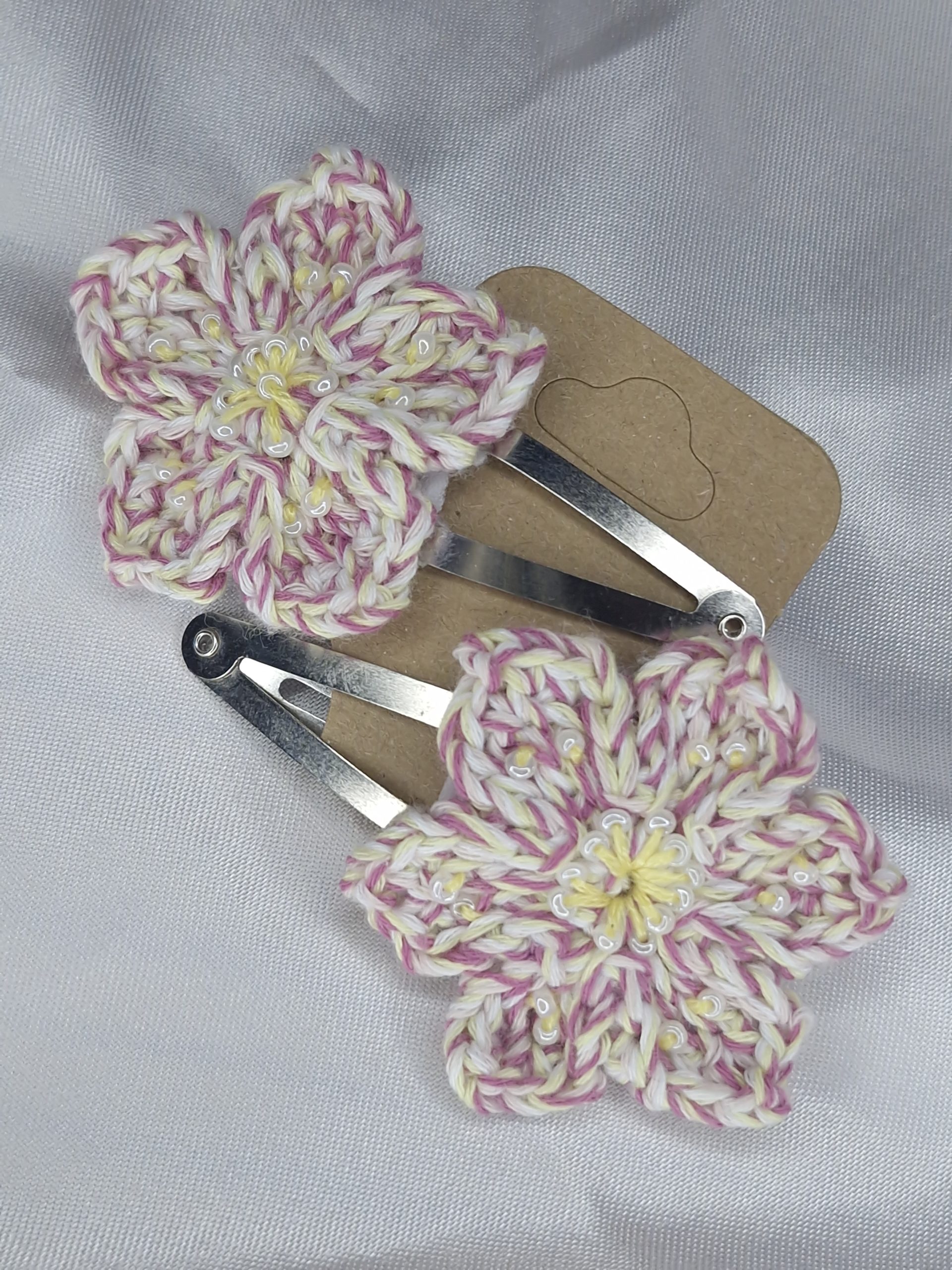 - Matières : fil de coton crocheté à la main, barrette clip argent, feutrine de protection