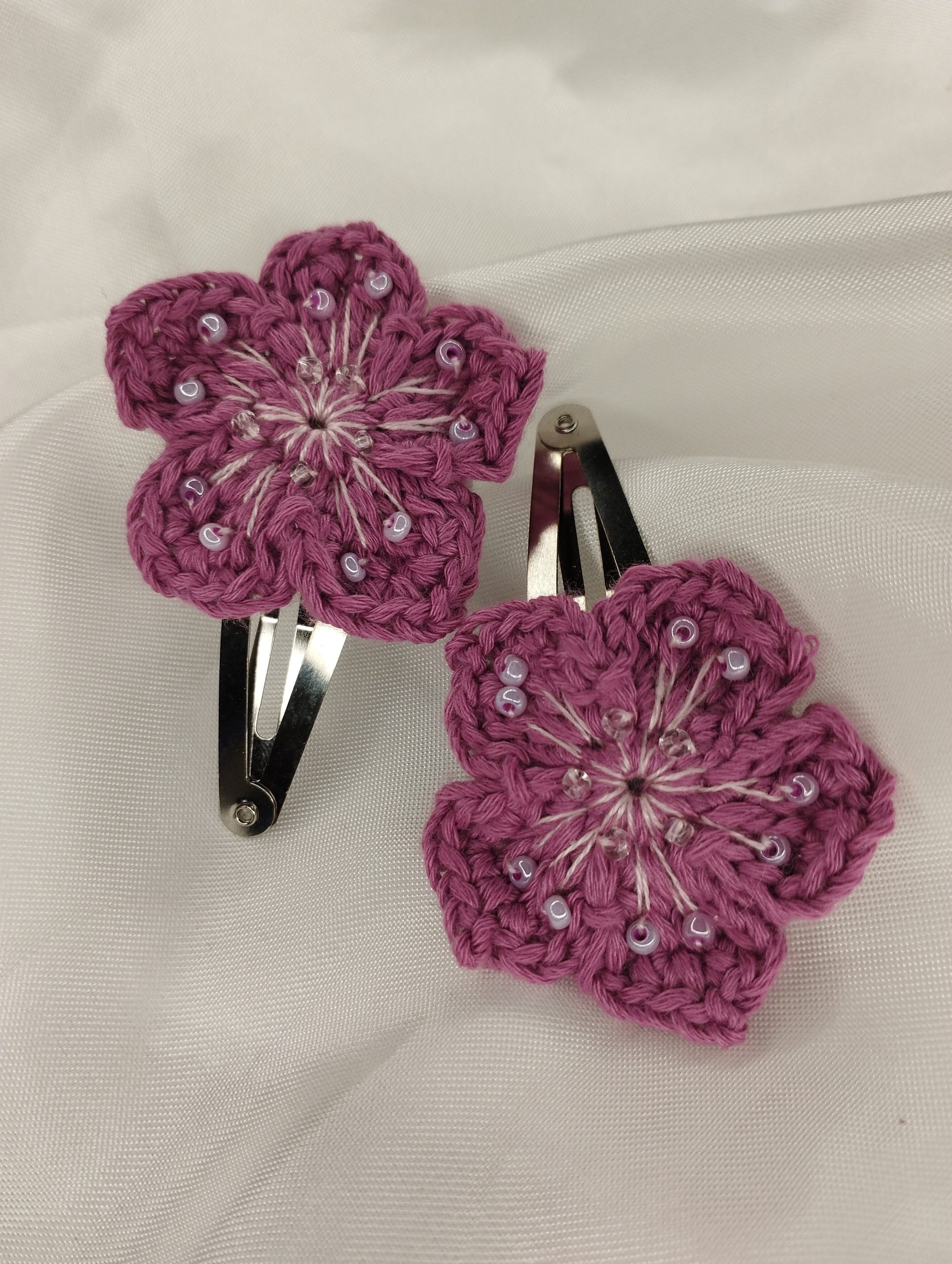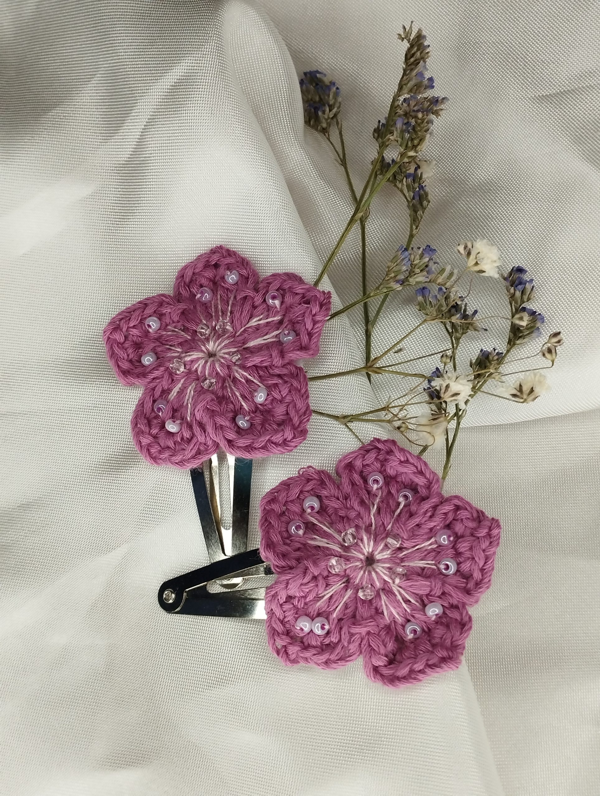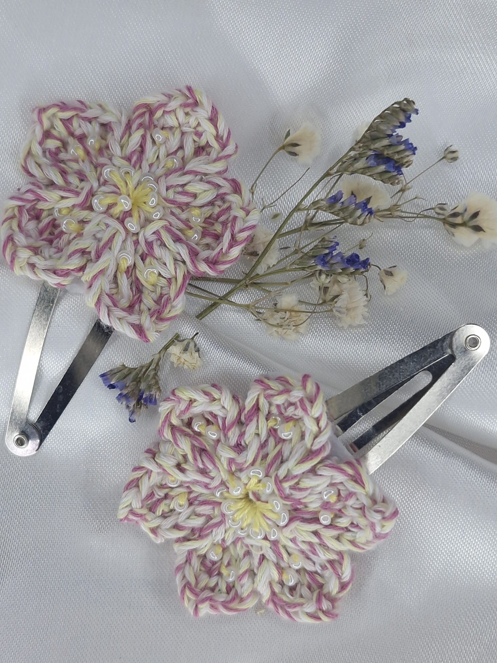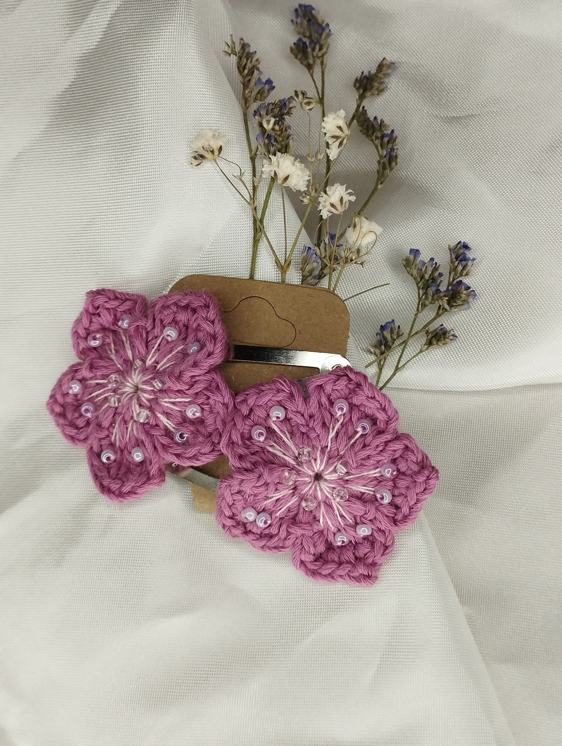 - Matières : fil de coton crocheté à la main, barrette clip argent, feutrine de protection