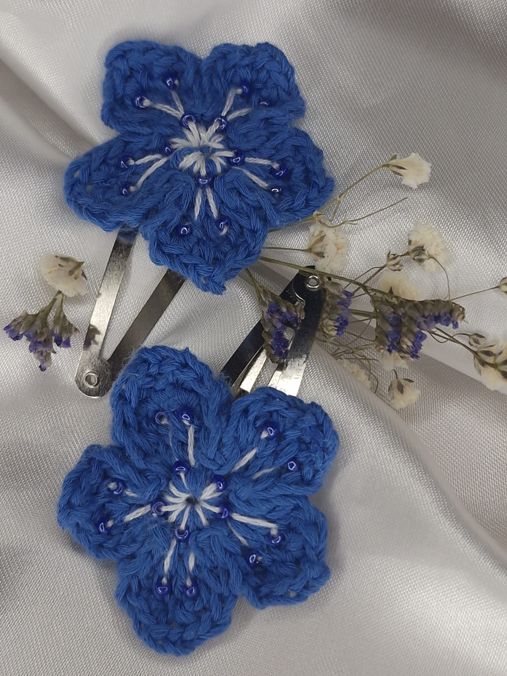 Chaque fleur de myosotis est crochetée à la main, puis délicatement ornée de perles et de fines broderies en son cœur, évoquant la rosée du matin déposée sur les pétales. Leur forme simple et élégante met en valeur la fleur tout en restant légère et agréable à porter au quotidien.
