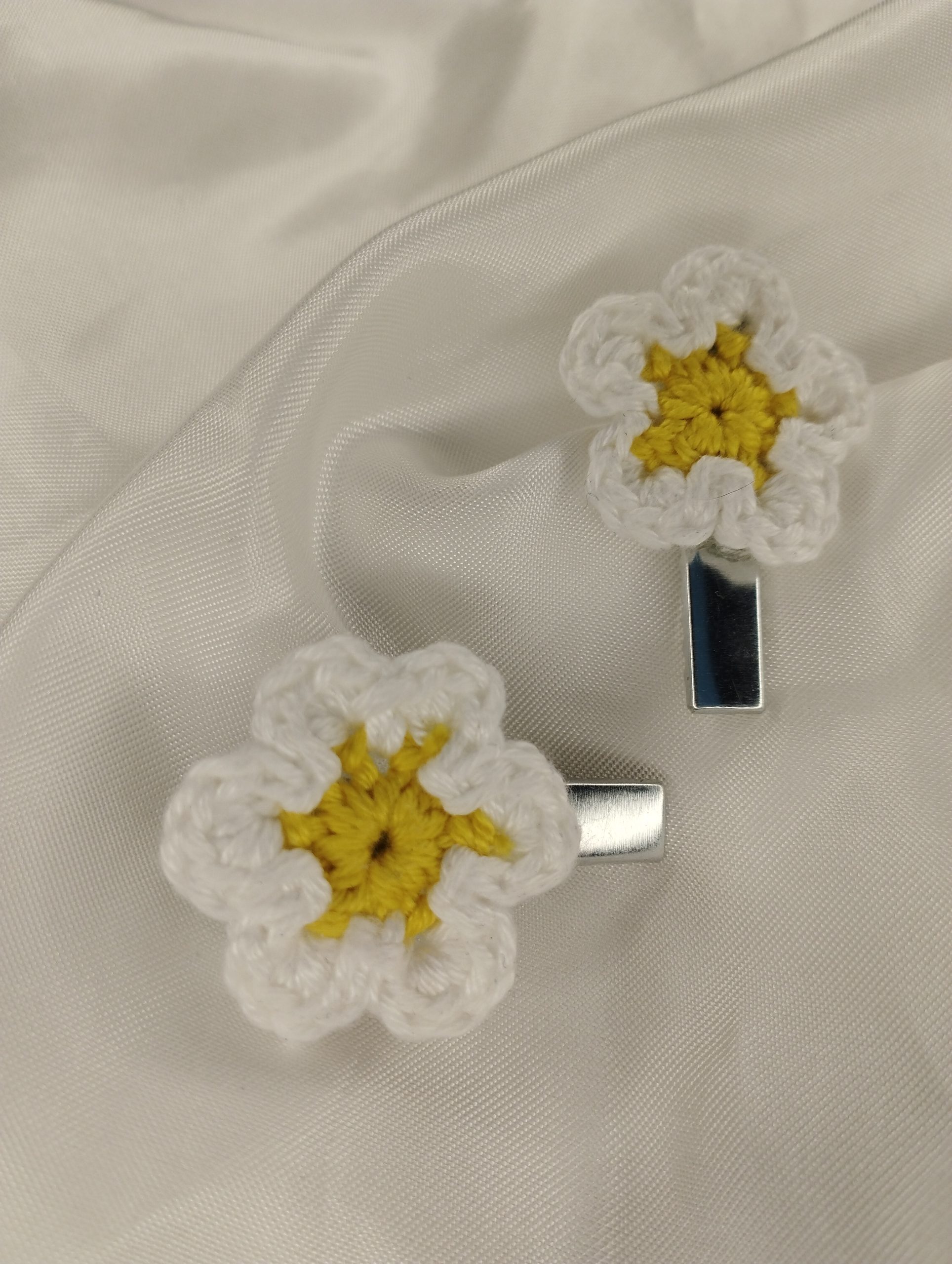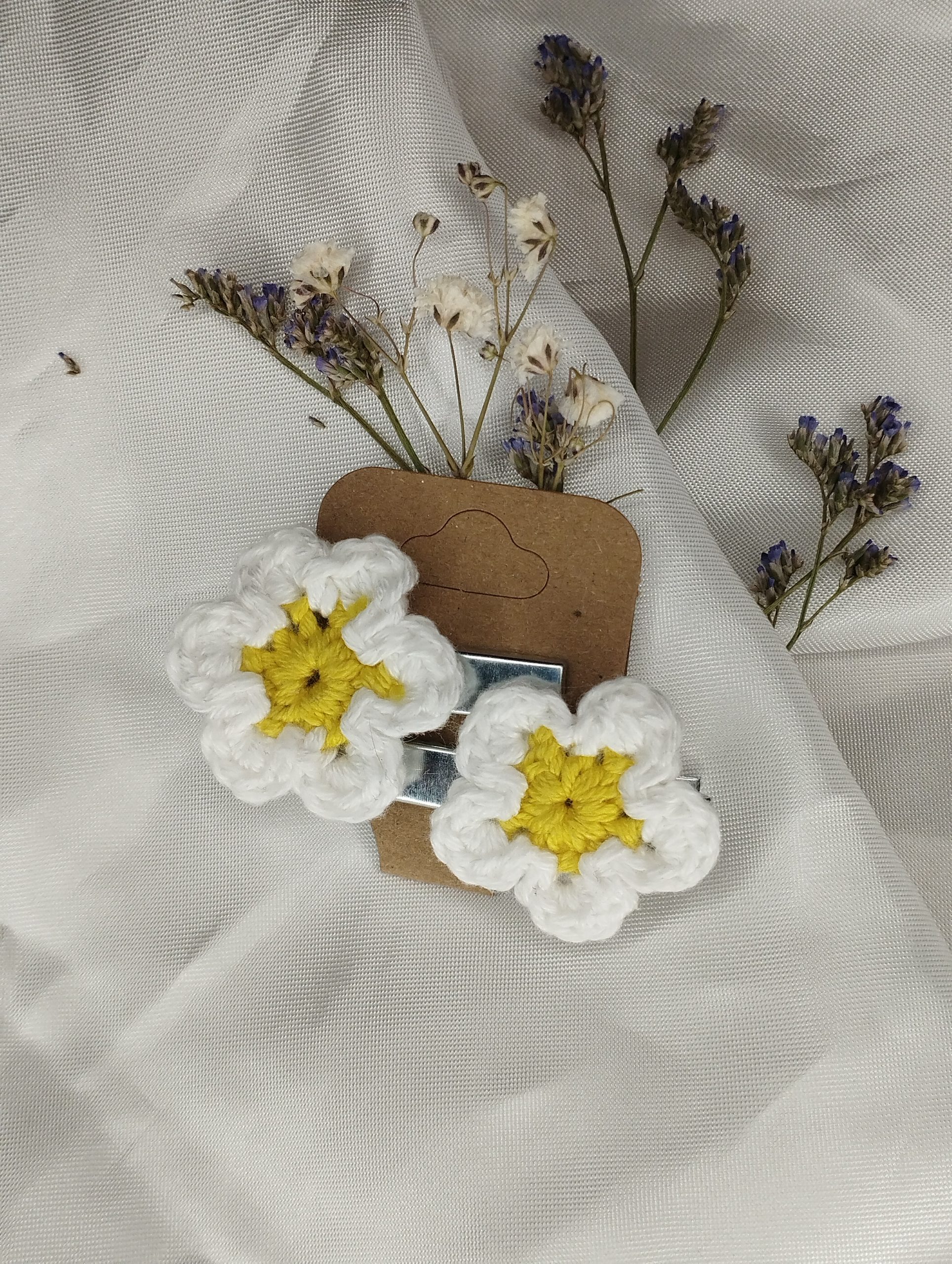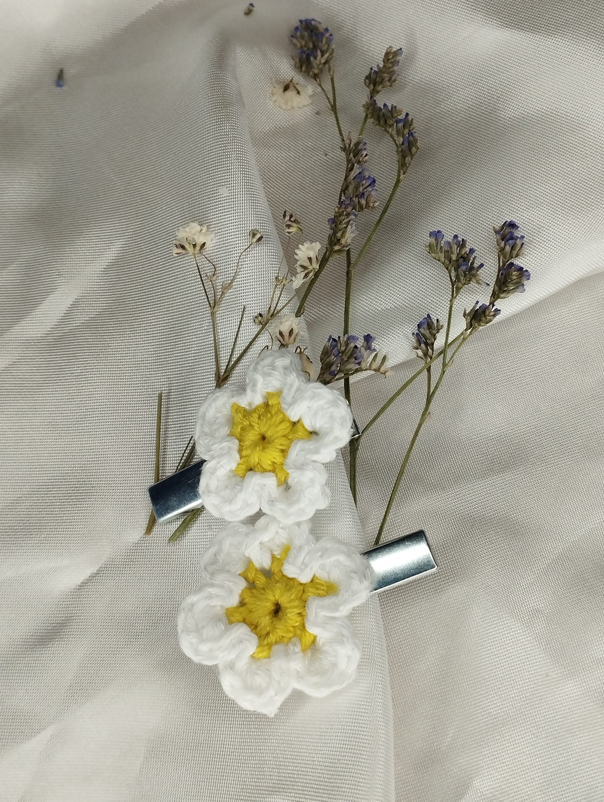Chaque marguerite est crochetée à la main, avec soin et minutie. Sa forme simple et délicate évoque la fraîcheur du printemps et la tendresse des souvenirs d’enfance. Discrètes et légères, ces barrettes se glissent facilement dans les cheveux pour retenir une mèche ou sublimer une coiffure avec douceur.